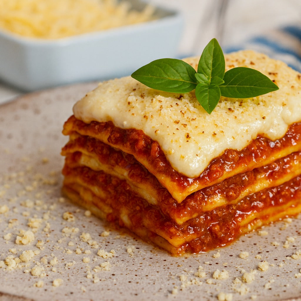 Lasanha Bolonhesa Premium, preparada com massa macia em camadas e molho bolonhesa de carne selecionada, garantindo sabor equilibrado e textura cremosa. Ideal para forno ou airfryer, prática para o dia a dia.